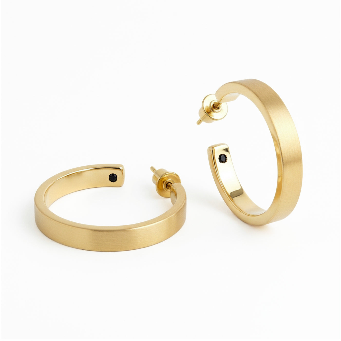 Minimalistické náušnice o průměru 1,8 cm a šířce 3 mm, s osazeným jemným zirkonem a zapínáním na puzetu.