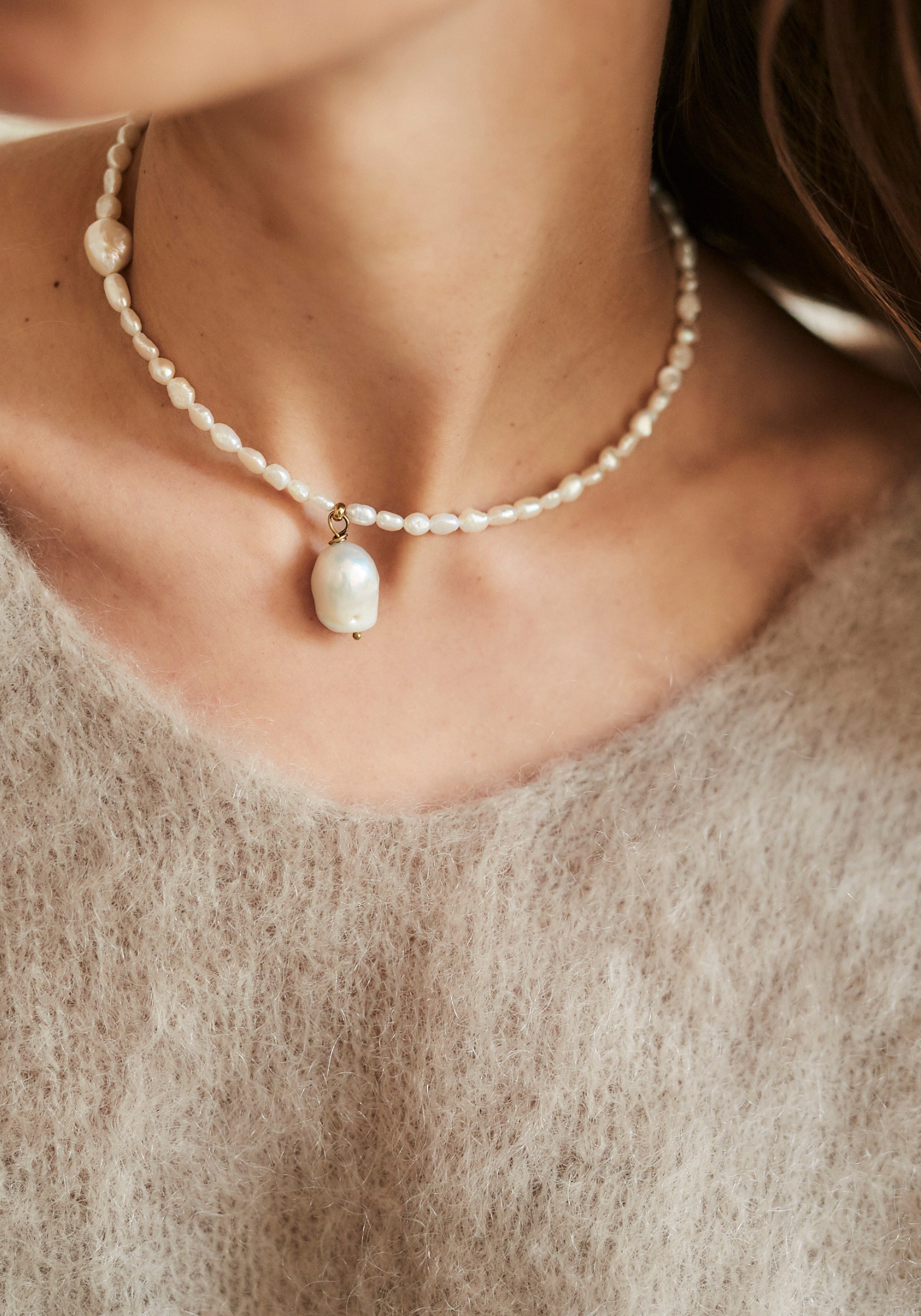 Ręcznie robiony naszyjnik wykonany z naturalnych pereł o nieregularnych kształtach, starannie dobieranych tak, aby stworzyć harmonijną i wyjątkową kompozycję. Każdy egzemplarz jest unikalny, dzięki czemu zyskujesz biżuterię jedyną w swoim rodzaju.